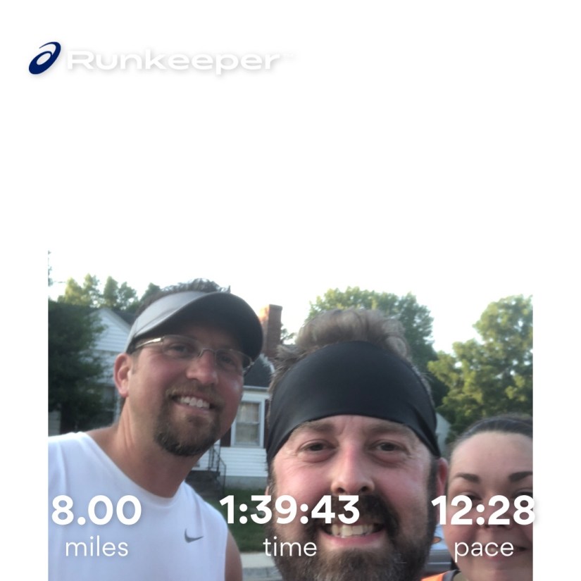 Long Run Saturday–8 miles in 1:39:43 with an average of 12:28 min/mi. Our man, MO ran out 3 miles with us and turned back for home while we finished out the 8. It was awesome having him run with us again! We were in a huge time crunch because I had to leave the house by 8:00 am for an event for work. That meant a wake-up time of 4:30 am and we hit the road at 5:30! What a good friend to wake up that early to run with us!