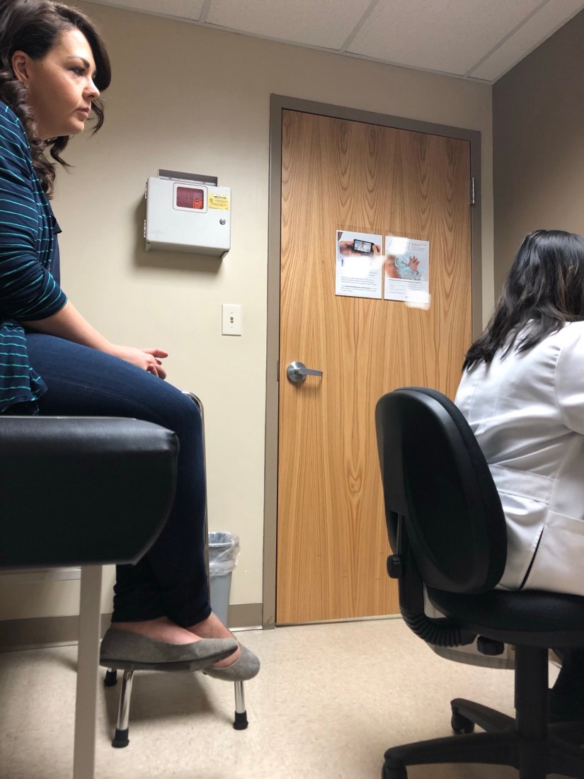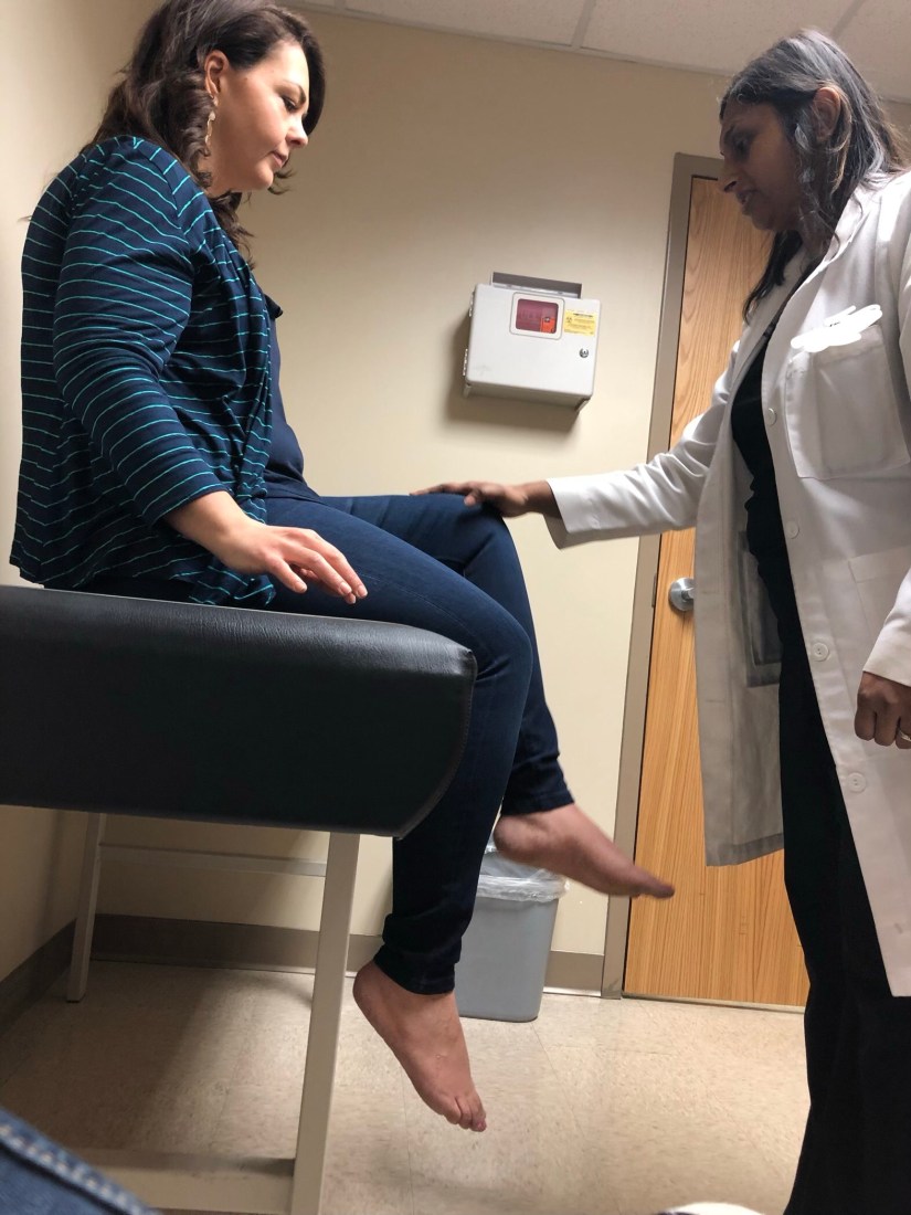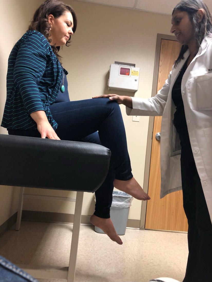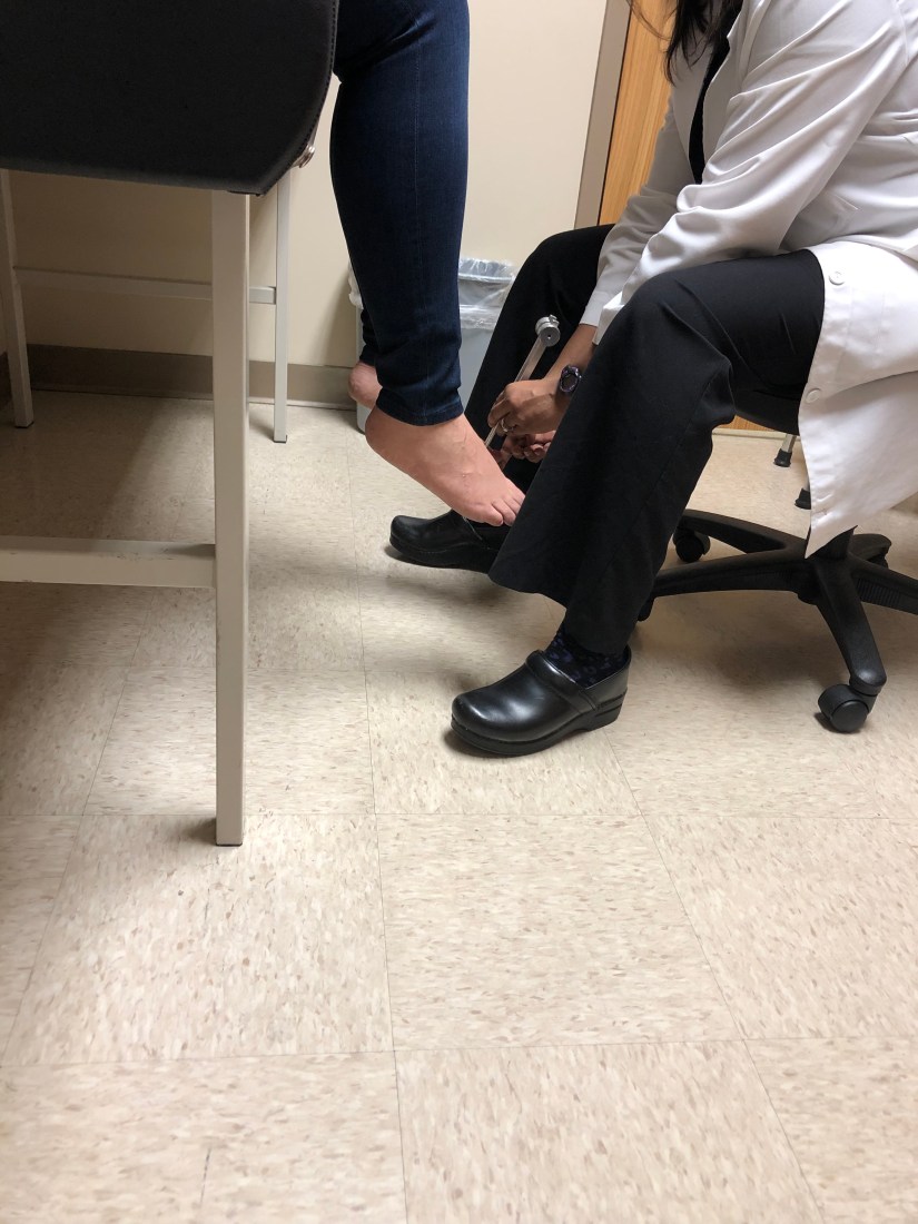 Then, she places a tuning fork on each hand and then each foot to test the “numbness” in my limbs. My feet are always more numb than my hands, but they are even on both sides.