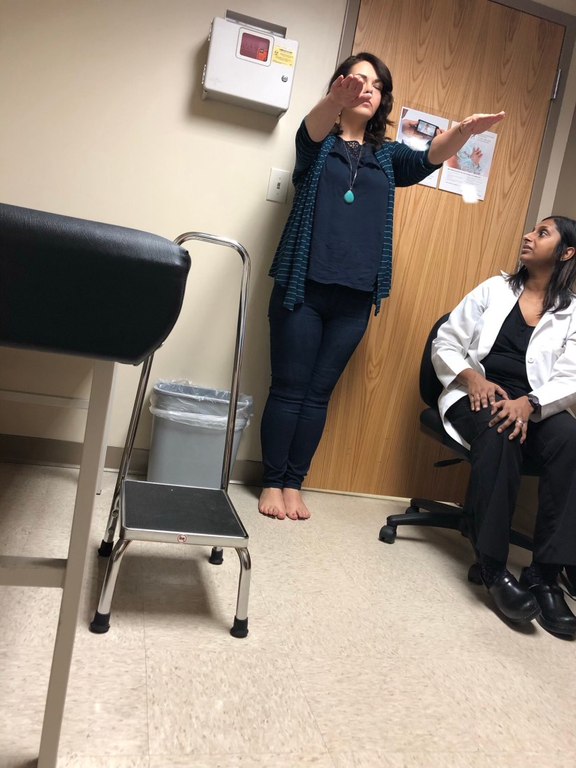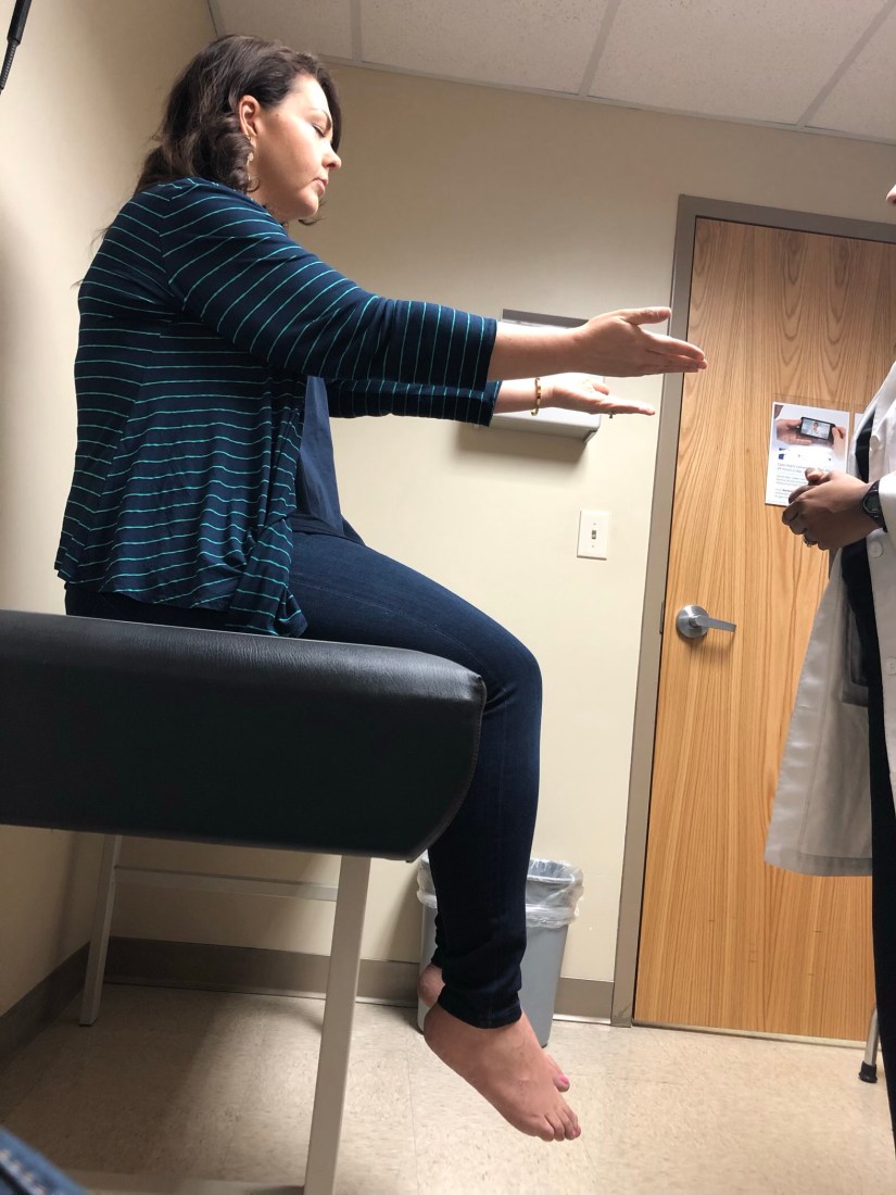 Then, I close my eyes and hold up my arms. She’s looking to see if I wobble or if one arm is lower than the other.
