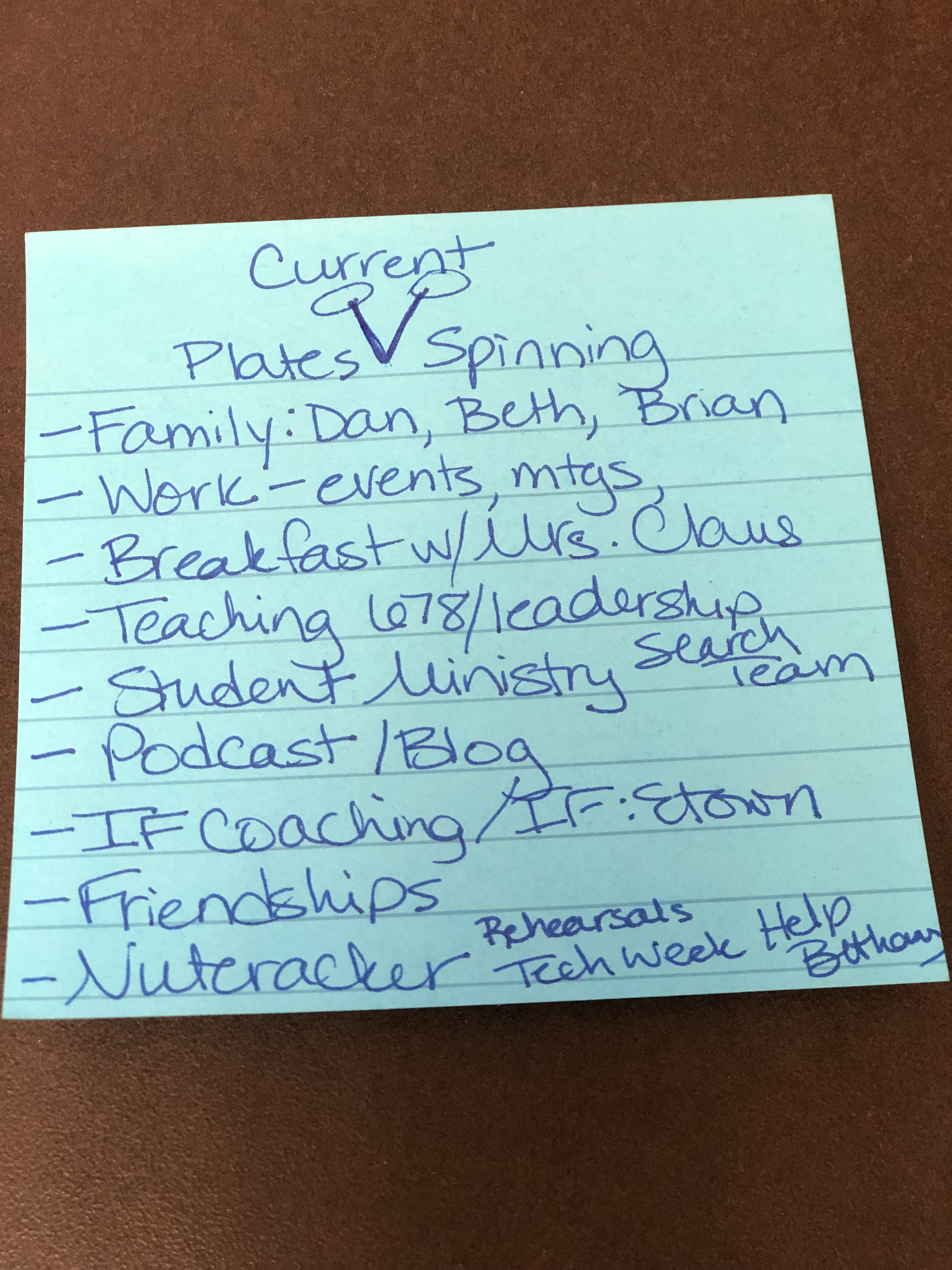 Like I said, on one particularly overwhelming afternoon, I wrote down this list of spinning plates and I prayed, “God. This is all yours. These are the things I have going on at the moment. And I’m ready to lay any one of the optional ones down. Obviously, my family and work and friends are pretty crucial for me so I kinda want to keep those 😊, but it’s all yours. Every plate. Take them. I feel tired. Can I do all of these things well? What can I lay down?