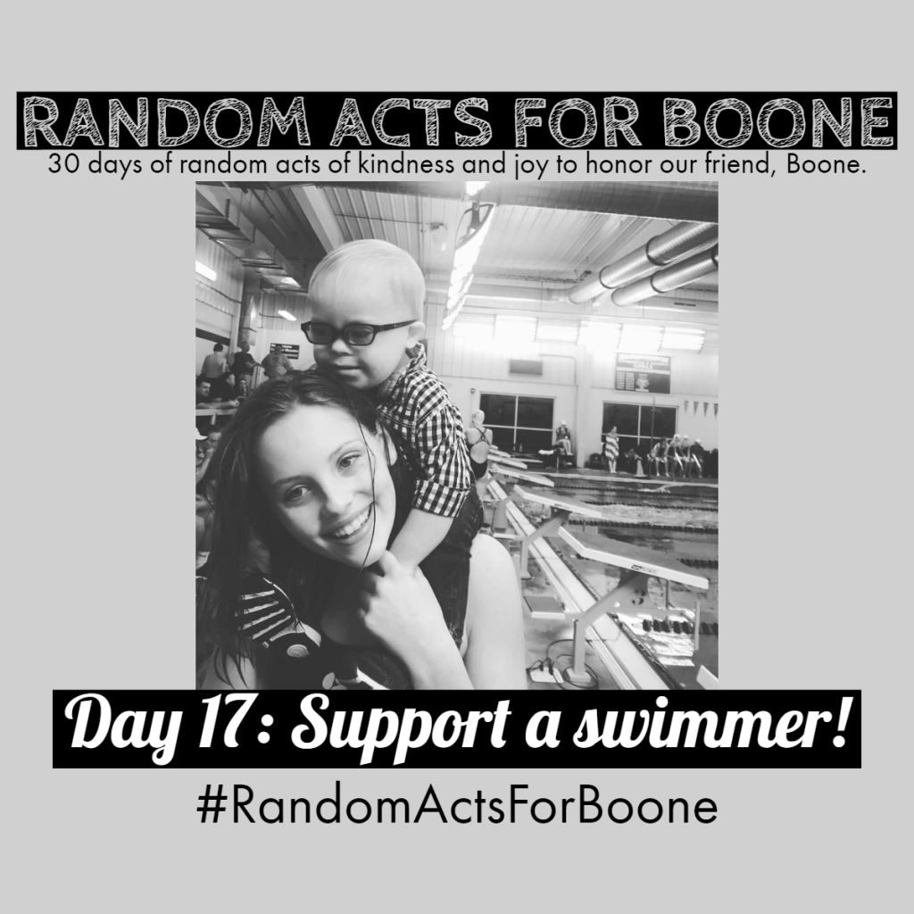 Boone’s big sister, Stella, is a rock-star swimmer! Swimming has been her therapy as she has processed her brother’s illness. Take time today to find away to support swimmers! Share an article, find a local school swim program and make a donation, or take some goodies to swimmers in your world.