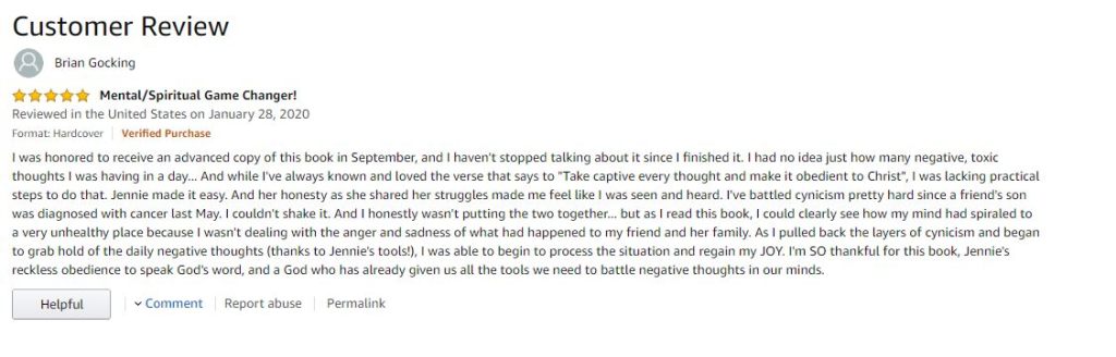 P.S. You need Jennie’s book in your life. Here is my official review on Amazon (and yes, I was accidentally logged into my husband’s account! HA!):