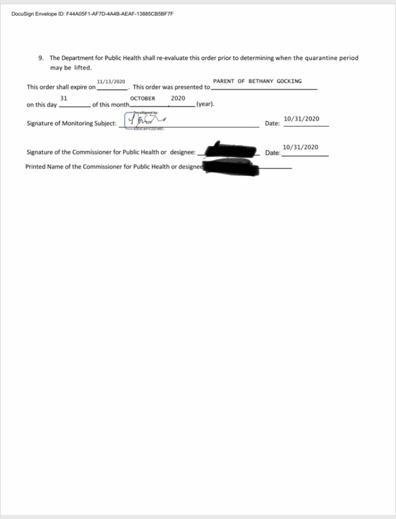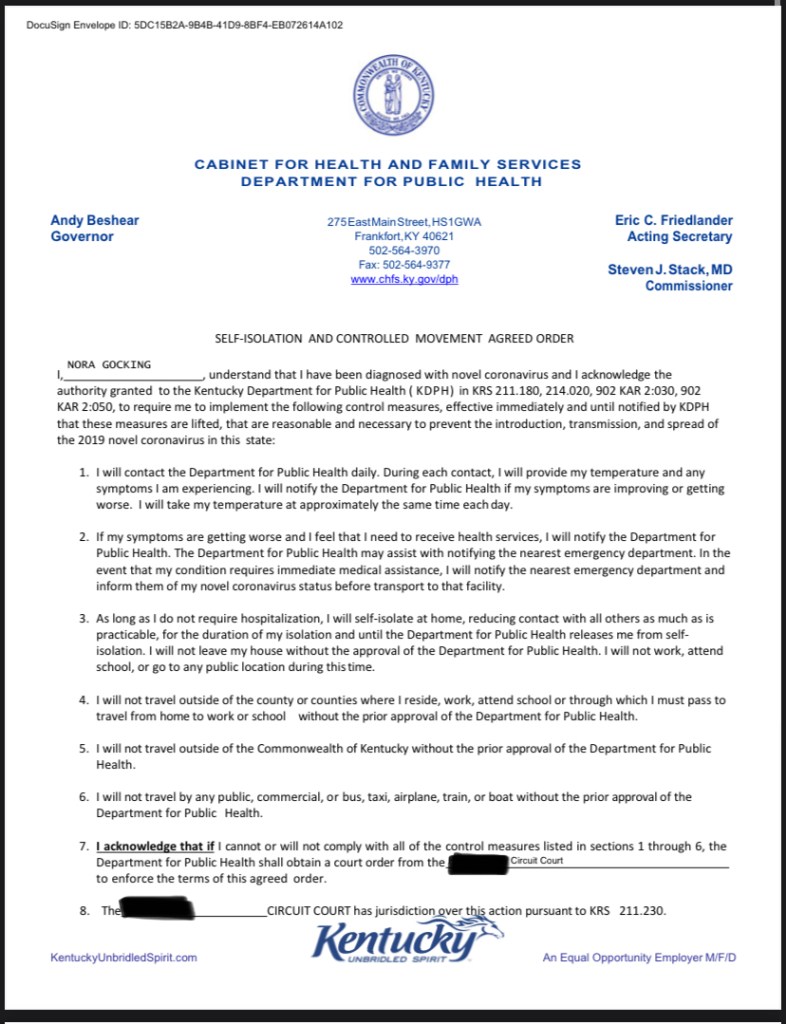 You may be wondering what the documents that a COVID positive person or a direct contact of a COVID positive person have to sign say. Well, in the state of Kentucky, this is what they look like. (Marked out info on my County and my contact tracer’s name).