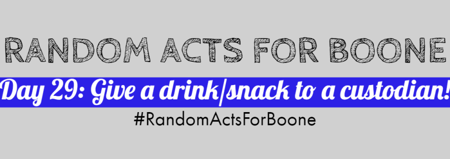 This one was a personal request from Emily :). She said custodians are the most overlooked folks in any organization. Today, let's change that. Pick up a yummy snack and drink and head out to a local school, hospital, or your work place and gift a custodian with a nice treat. You will help them… Continue reading #RandomActsForBoone Day 29!