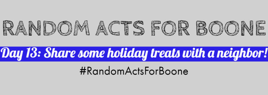 Take this opportunity to say hi to that neighbor you never speak to. One of our family's favorite Christmas traditions is to take treats to our neighbors on Christmas Eve. You never know who's feeling lonely and how much it will brighten their day! Be sure to share the story of what you did (or… Continue reading #RandomActsForBoone Day 13!