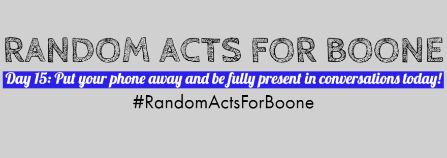 It's so easy to bury our faces in our phones and ignore the world going on around us. Make a change today. Put the phone away and have real conversations with your people. Be sure to share the story of what you did (or photos or videos) on social media with the hashtag #RandomActsforBoone!