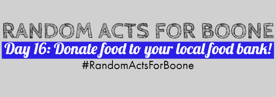 Clean out your pantry! Make a run to the grocery store! And share your bounty with a local food bank to help others :). Be sure to share the story of what you did (or photos or videos) on social media with the hashtag #RandomActsforBoone!