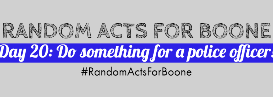 Every little boy loves the men and women in blue! Take the time today to thank Police Officers when you see then or take some goodies to your local police station! Be sure to share the story of what you did (or photos or videos) on social media with the hashtag #RandomActsforBoone!